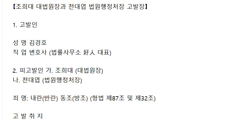 À̹ø °í¹ßÀº Á¶Èñ´ë ´ë¹ý¿øÀå°ú õ´ë¿± ¹ý¿øÇàÁ¤Ã³ÀåÀÌ À±¼®¿ ¼¼·ÂÀÇ ³»¶õ(¹Ý¶õ) ÇàÀ§¸¦ µ½°í, Á¤ÀÇÀÇ ½ÇÇöÀ» ¹æÇØÇß´Ù´Â ÇøÀǸ¦ ´ã°í ÀÖÀ¸¸ç, °í¹ßÀÎÀÌ ÁÖÀåÇÏ´Â ÇÙ½É ³»¿ëÀº ´ÙÀ½ÀÇ ¼¼ °¡Áö·Î,