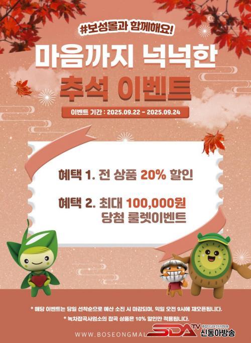 [½Åµ¿¾Æ¹æ¼Û Àü³²º¸¼º=¹Ú±¤¿Á±âÀÚ] Àü³² º¸¼º±ºÀº Ãß¼® ¸íÀýÀ» ¸Â¾Æ 22ÀϺÎÅÍ 3Àϰ£ ³óƯ»ê¹° ¿Â¶óÀÎ ¼îÇθô ¡®º¸¼º¸ô¡¯¿¡¼­ ÃÖ´ë 20% ÇÒÀΰú ´Ù¾çÇÑ Àû¸³ À̺¥Æ®°¡ ÇÔ²²Çϴ Ưº° ÇÒÀÎ Çà»ç¸¦ ÁøÇàÇÑ´Ù.