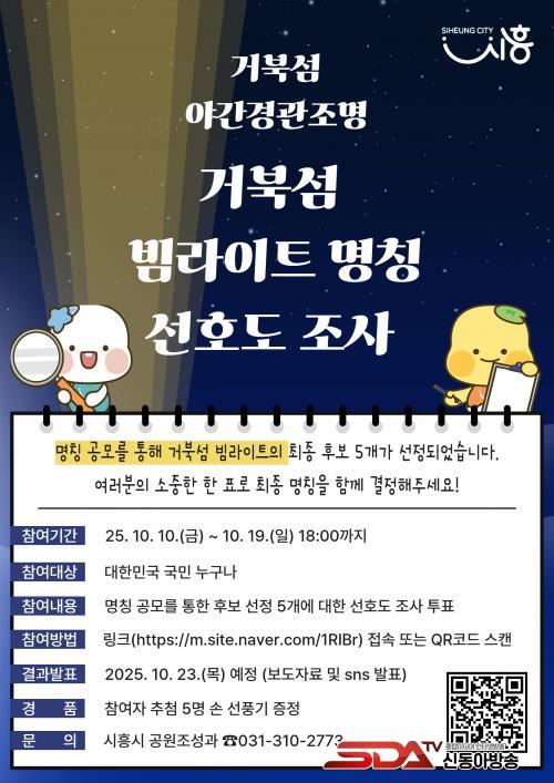 [½Åµ¿¾Æ¹æ¼Û ½ÃÈï½Ã=À̽ŵ¿±âÀÚ] ½ÃÈï½Ã´Â ¿À´Â 10¿ù 10ÀϺÎÅÍ 19ÀÏ ¿ÀÈÄ 6½Ã±îÁö ¡®°ÅºÏ¼¶ ¾ß°£°æ°üÁ¶¸í(ºö¶óÀÌÆ®)¡¯ÀÇ ¸íĪ °ø¸ð ¼±È£µµ Á¶»ç¸¦ ÁøÇàÇÑ´Ù. ½Ã´Â À̹ø ¼±È£µµ Á¶»ç °á°ú¸¦ ¹Ý¿µÇØ ÃÖÁ¾ ¸íĪÀ» ¼±Á¤ÇÑ´Ù.