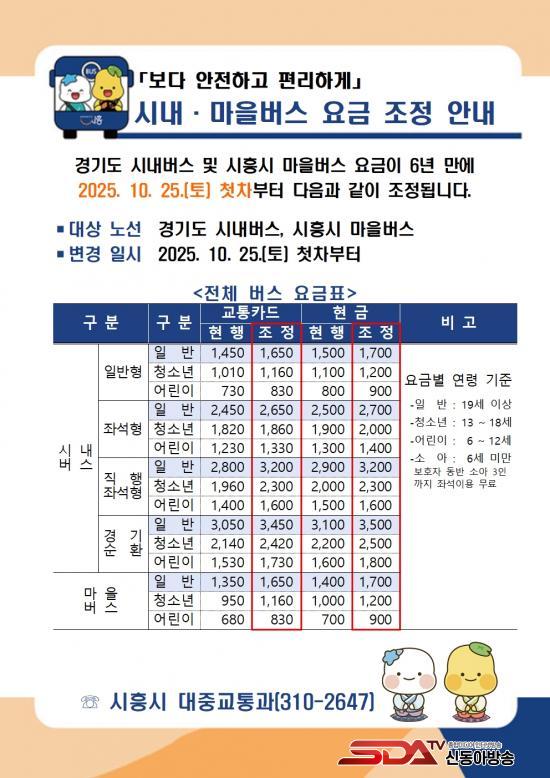 Á¶Á¤µÈ ¿ä±ÝÀº ±³ÅëÄ«µå ±âÁØÀ¸·Î, °æ±âµµ ½Ã³»¹ö½º ÀϹÝÇüÀÇ °æ¿ì ¡ã¼ºÀÎ 1,450¿ø¿¡¼ 1,650¿ø(200¿ø Àλó)À¸·Î ¡ãû¼Ò³â 1,010¿ø¿¡¼ 1,160¿ø(150¿ø Àλó)À¸·Î ¡ã¾î¸°ÀÌ 730¿ø¿¡¼ 830¿ø(100¿ø Àλó)À¸·Î ¿À¸£°Ô µÈ´Ù. ½ÃÈï½Ã ¸¶À»¹ö½º ¿ä±ÝÀº ¡ã¼ºÀÎ 1,350¿ø¿¡¼ 1,650¿ø(300¿ø Àλó)À¸·Î ¡ãû¼Ò³â 950¿ø¿¡¼ 1,160¿ø(210¿ø Àλó)À¸·Î ¡ã¾î¸°ÀÌ 680¿ø¿¡¼ 830¿ø(150¿ø Àλó)À¸·Î Á¶Á¤µÈ´Ù.