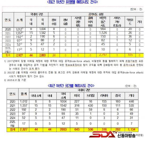 Á¤ÀÏ¿µ ÀÇ¿ø¿¡ µû¸£¸é 2020³âºÎÅÍ ¿ÃÇØ 8¿ù±îÁö ŽÁöµÈ ÇØÅ· ½Ãµµ 2,927°Ç Áß 98.5%(2,883°Ç)°¡ ±¹¿Ü¿¡¼ ¹ß»ýÇßÀ¸¸ç, ÁÖµÈ °ø°Ý À¯ÇüÀº Á¤º¸¼öÁý(96%)°ú ¼ºñ½º°ÅºÎ(DDoS) °ø°ÝÀ̾ú´Ù. ƯÈ÷ Áö³ÇØ 12¿ù¿¡´Â Çѱ¹ÀºÇà ȨÆäÀÌÁö°¡ DDoS °ø°ÝÀ» ¹Þ¾Æ Á¢¼Ó Áö¿¬ ÇÇÇØ°¡ ¹ß»ýÇÑ ¹Ù ÀÖ´Ù.