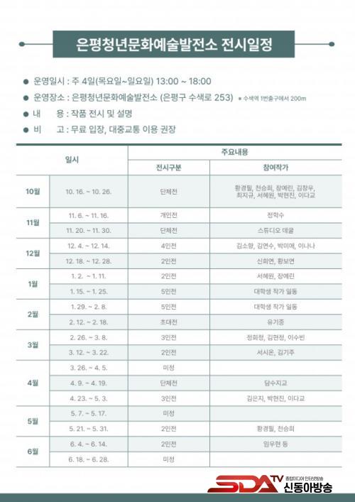 Àü½Ã´Â ÀºÆòû³â¹®È­¿¹¼ú¹ßÀü¼Ò¿¡¼­ ¸ÅÁÖ ¸ñ¿äÀϺÎÅÍ ÀÏ¿äÀÏ, ¿ÀÈÄ 1½ÃºÎÅÍ 6½Ã±îÁö ÁøÇàµÇ¸ç, ¹æ¹®°´µéÀº ´©±¸³ª ÀÚÀ¯·Ó°Ô °ü¶÷ÇÒ ¼ö ÀÖ´Ù. ƯÈ÷ ¸Å´Þ 2~3ȸ Àü½Ãȸ°¡ º¯°æµÅ »õ·Î¿î ÀÛǰµéÀÌ °è¼ÓÇØ¼­ ¼±º¸ÀÏ ¿¹Á¤ÀÌ´Ï, ÀºÆò±¸¹ÎµéÀÇ ¸¹Àº °ü½É°ú ¹æ¹®À» ¹Ù¶õ´Ù.
