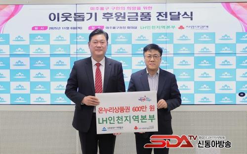 [½Åµ¿¾Æ¹æ¼Û ÀÎõ=À±¹Î½Ä±âÀÚ]ÀÎõ ¹ÌÃßȦ±¸(±¸Ã»Àå ÀÌ¿µÈÆ)´Â 6ÀÏ ±¸Ã»Àå½Ç¿¡¼­ Çѱ¹ÅäÁöÁÖÅðø»ç(LH) ÀÎõÁö¿ªº»ºÎ(º»ºÎÀå ¼­È¯½Ä)·ÎºÎÅÍ ¾Æµ¿º¹Áö½Ã¼³ Áö¿øÀ» À§ÇÑ ¿Â´©¸®»óǰ±Ç 600¸¸ ¿øÀ» Àü´Þ¹Þ¾Ò´Ù.