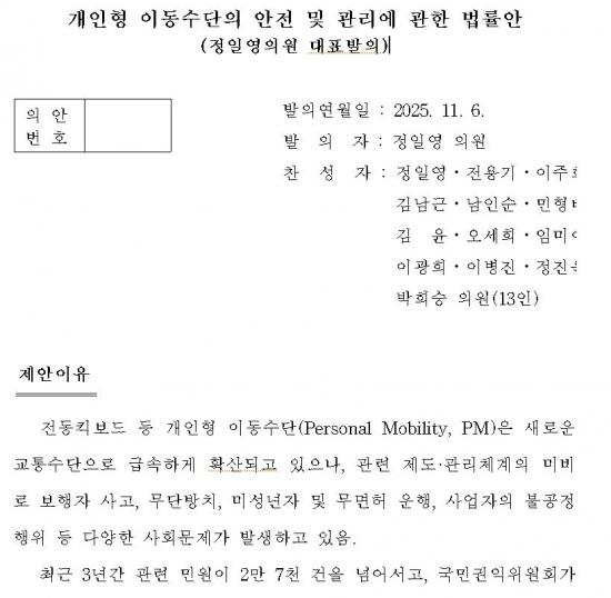 [½Åµ¿¾Æ¹æ¼Û ÀÎõ=À±¹Î½Ä±âÀÚ]7ÀÏ(±Ý), ±¹È¸ ±âȹÀçÁ¤À§¿øÈ¸ Á¤ÀÏ¿µ ÀÇ¿ø(ÀÎõ ¿¬¼öÀ», ´õºÒ¾î¹ÎÁÖ´ç)Àº Àüµ¿Å±º¸µå µî °³ÀÎÇü À̵¿¼ö´Ü(Personal Mobility, PM)ÀÇ ¹«Áú¼­ÇÑ ¿îÇà°ú °ü¸® ºÎ½ÇÀ» ÇØ°áÇϱâ À§ÇÑ ¡¸°³ÀÎÇü À̵¿¼ö´ÜÀÇ ¾ÈÀü ¹× °ü¸®¿¡ °üÇÑ ¹ý·ü¾È¡¹À» ´ëÇ¥ ¹ßÀÇÇß´Ù.
