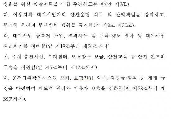 À̹ø ¹ý¾ÈÀº °³ÀÎÇü À̵¿¼ö´Ü °ü¸®¸¦ ±¹³» óÀ½À¸·Î¡®±âº»¹ý¡¯¼öÁØ¿¡¼­ ÅëÇÕ °ü¸®Çϵµ·Ï ÇÏ¿´´Ù. ƯÈ÷, ÁöÀÚü°¡ º¸ÇàÀÚ ¾ÈÀü À§ÇùÀÌ ½É°¢ÇÑ Áö¿ª¿¡ ¡®Å±º¸µå ±ÝÁö±¸¿ª¡¯À» Á÷Á¢ ÁöÁ¤¡¤°ü¸®ÇÒ ¼ö ÀÖµµ·Ï Çϰí, ´ë¿©»ç¾÷ÀÚ¿¡°Ô ¿îÀüÀÚ°Ý È®ÀÎ Àǹ«¿Í ¹«¸éÇ㡤¹Ì¼º³âÀÚ ¿îÀü ±ÝÁö¸¦ °­È­Çß´Ù.