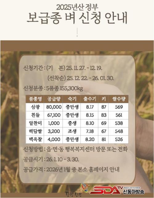 À¾¸éµ¿º° ¹èÁ¤·®¿¡ µû¶ó 1Â÷ ½Åû ±â°£(2025. 11. 27.~12. 19.) µ¿¾È ½Åû¹Þ¾Æ ±âº» ¹°·®À» ¹èÁ¤Çϰí, ÀÌÈÄ Á¶Á¤ ±â°£(2025. 12. 22.~2026. 1. 30.)¿¡´Â ÀÜ·®¿¡ ÇÑÇØ ¼±Âø¼øÀ¸·Î ½Åû¹Þ´Â´Ù. ³ó¾÷ÀÎÀº ÇØ´ç ±â°£¿¡ ÁÖ¼ÒÁö À¾¸éµ¿ ÇàÁ¤º¹Áö¼¾Å͸¦ ¹æ¹®Çϰųª À¯¼±À¸·Î ½ÅûÇÏ¸é µÈ´Ù.