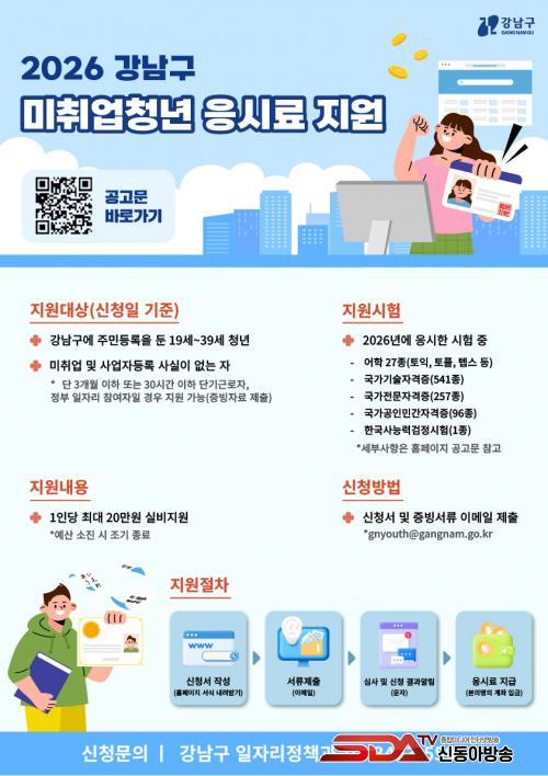 Áö¿ø ´ë»óÀº °³²±¸¿¡ Áֹεî·ÏÀ» µÐ ¸¸ 19~39¼¼ ¹ÌÃë¾÷ û³âÀÌ´Ù. 2026³â¿¡ ÀÀ½ÃÇÑ ¾îÇнÃÇè°ú ÀÚ°ÝÁõ ½ÃÇè ÀÀ½Ã·á¸¦ 1Àδç ÃÖ´ë 20¸¸ ¿ø±îÁö Áö¿øÇÑ´Ù. Çѵµ ³»¿¡¼ ¿©·¯ ½ÃÇèÀ» ÀÚÀ¯·Ó°Ô ½ÅûÇÒ ¼ö ÀÖÀ¸¸ç, ÇÕ°Ý ¿©ºÎ¿Í °ü°è¾øÀÌ Áö¿øÇÑ´Ù.