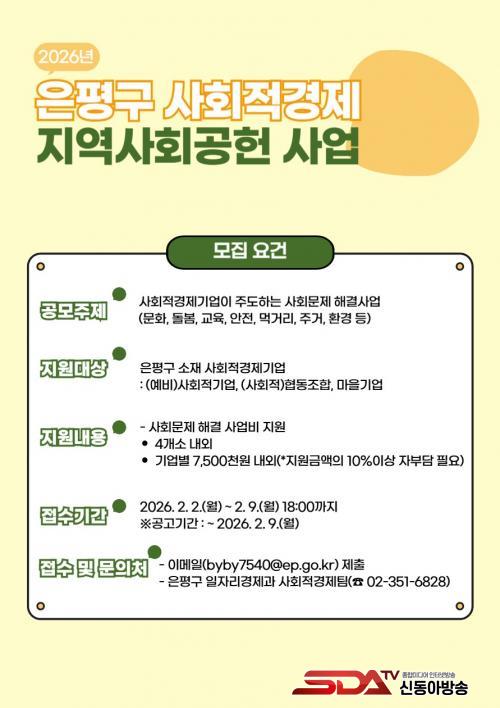 ¸ðÁý ´ë»óÀº ÀºÆò±¸¿¡ ¼ÒÀçÇÑ (¿¹ºñ)»çȸÀû±â¾÷, (»çȸÀû)Çùµ¿Á¶ÇÕ, ¸¶À»±â¾÷ µîÀÌ´Ù. ¸éÁ¢ ½É»ç¸¦ ÅëÇØ »ç¾÷°èȹÀÇ ÀûÁ¤¼º, Çõ½Å¼º, »çȸÀû °¡Ä¡ ±â¿©µµ µîÀ» Á¾ÇÕÀûÀ¸·Î Æò°¡ÇØ ½ÇÁúÀûÀÎ Áö¿ª º¯È·Î À̾îÁú ¼ö ÀÖ´Â Áö¿ª»çȸ°øÇå»ç¾÷À» ¼±Á¤ÇÒ ¿¹Á¤ÀÌ´Ù.