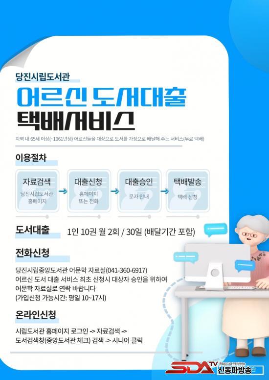 ¡®¾î¸£½Å µµ¼­ ´ëÃâ ÅÃ¹è ¼­ºñ½º¡¯´Â 65¼¼ ÀÌ»ó ¾î¸£½ÅÀ» ´ë»óÀ¸·Î, µµ¼­°ü ´©¸®ÁýÀ» ÅëÇÑ ¿Â¶óÀÎ ½ÅûÀº ¹°·Ð ÀüÈ­(¢Ï041-360-6917)·Îµµ °£ÆíÇÏ°Ô µµ¼­¸¦ ½ÅûÇÒ ¼ö ÀÖ¾î °í·ÉÃþÀÇ ÀÌ¿ë ÆíÀǸ¦ ³ô¿´´Ù.