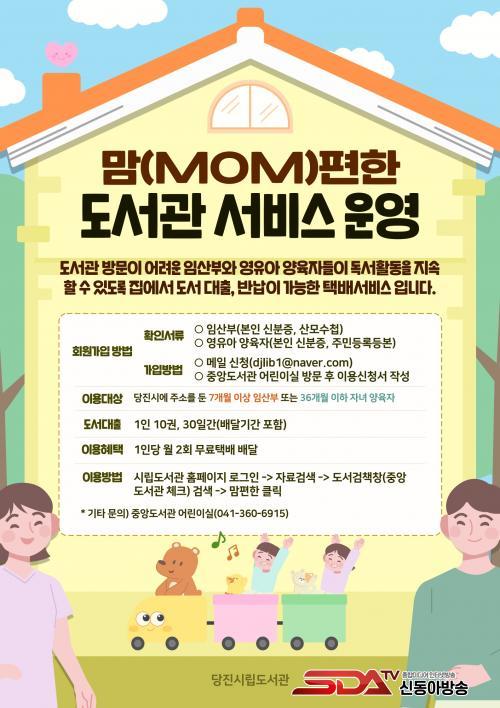 [½Åµ¿¾Æ¹æ¼Û=ÀÌÀçö±âÀÚ] ´çÁø½Ã´Â µµ¼­°ü ¹æ¹®ÀÌ ¾î·Á¿î ½Ã¹ÎµéÀ» À§ÇØ ´çÁø½Ã¸³µµ¼­°ü¿¡¼­ ¡®¸¾(MOM)ÆíÇÑ µµ¼­°ü ¼­ºñ½º¡¯¿Í ¡®¾î¸£½Å µµ¼­ ´ëÃâ ÅÃ¹è ¼­ºñ½º¡¯¸¦ ¿î¿µÇϰí ÀÖ´Ù°í 27ÀÏ ¹àÇû´Ù.