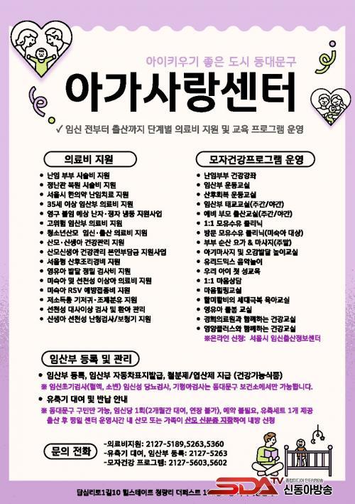 ÇÁ·Î±×·¥ ½Åû¡¤¹®ÀÇ´Â µ¿´ë¹®±¸ ¾Æ°¡»ç¶û¼¾ÅÍ(¢Ï02-2127-5603)¸¦ ÅëÇØ ¾È³»¹ÞÀ» ¼ö ÀÖ´Ù. ¾Æ°¡»ç¶û¼¾Åʹ û·®¸®¿ª 6¹ø Ãⱸ ÀαÙ(¼­¿ï µ¿´ë¹®±¸ ´ä½Ê¸®·Î1±æ 10, 2Ãþ)¿¡ À§Ä¡ÇÑ ¸ðÀÚº¸°Ç¼¾ÅÍ·Î, Àӽš¤Ãâ»ê¡¤À°¾Æ ´Ü°èº° ÇÁ·Î±×·¥°ú »ó´ãµµ ¿î¿µÇÑ´Ù.