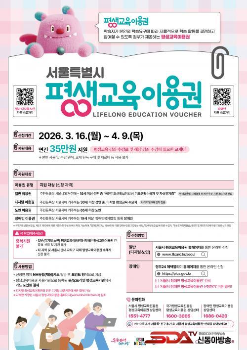 [½Åµ¿¾Æ¹æ¼Û µµºÀ±¸=À̽ŵ¿±âÀÚ] ¼­¿ï µµºÀ±¸°¡ 2026³â Æò»ý±³À°ÀÌ¿ë±Ç ½ÅûÀÚ¸¦ 4¿ù 9ÀϱîÁö Á¢¼öÇÑ´Ù.