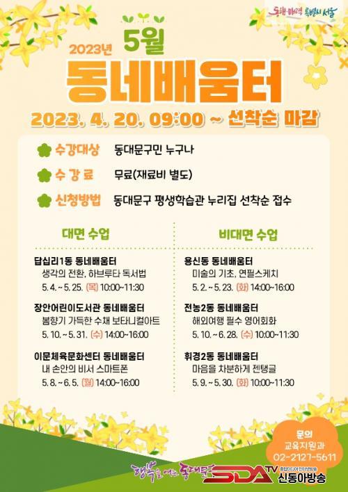 5¿ù µ¿³×¹è¿òÅÍ ÇÁ·Î±×·¥¿¡ Âü¿©ÇϰíÀÚ ÇÏ´Â ±¸¹ÎÀº ¿À´Â 30ÀϱîÁö µ¿´ë¹®±¸ Æò»ýÇнÀ°ü ´©¸®Áý(https://www.ddm.go.kr/lll/index.do) ÇÁ·Î±×·¥ Á¢¼ö¶õ¿¡¼­ ¼±Âø¼øÀ¸·Î ½Åû°¡´ÉÇϸç, ¼ö°­·á´Â ¹«·á´Ù. ´Ù¸¸, ÇÁ·Î±×·¥ Ư¼º¿¡ µû¶ó ¹ß»ýÇÏ´Â Àç·áºñ¿Í ±³Àçºñ´Â ¼ö°­»ýÀÌ Á÷Á¢ ºÎ´ãÇØ¾ß ÇÑ´Ù.