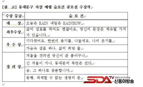 ´ë»ó ¼ö»óÀÛ ¡®¿À´ÃÀº RAIN, ³»ÀÏÀº RAINBOW¡¯¿¡ ´ëÇÑ ÀÇ¹Ì ¼³¸íµµ À̾îÁ³´Ù. ´ë»ó ¼ö»óÀÚ´Â ¡°¾î·Á¿î ¼ø°£Àº ¿µ¿øÇÏÁö ¾Ê´Ù´Â Àǹ̸¦ Àü´ÞÇÏ°í ½Í¾ú´Ù.¡±¶ó¸ç ¡°ºñ°¡ ³»·Á¾ß ¹«Áö°³°¡ ¶ßµí, ¾î·Á¿î ¼ø°£ÀÌ Áö³ª¸é ÁÁÀº ³¯ÀÌ ¿Â´Ù´Â Èñ¸ÁÀûÀÎ ¸Þ½ÃÁö¸¦ ´ã¾Ò´Ù.¡±°í ¸»Çß´Ù. ¼±Á¤µÈ ÃÑ 8°³ÀÇ ½½·Î°ÇÀº ÇâÈÄ µ¿´ë¹®±¸ÀÇ ÀÚ»ì ¿¹¹æ »ç¾÷¿¡ Àû±Ø Ȱ¿ëµÉ ¿¹Á¤ÀÌ´Ù.