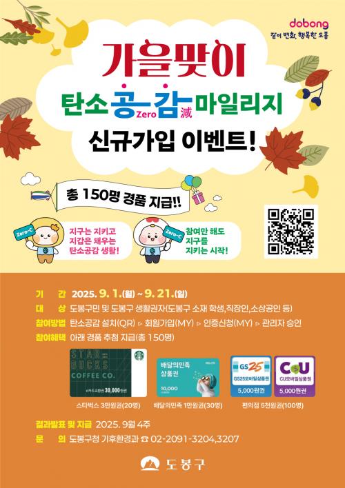 [½Åµ¿¾Æ¹æ¼Û µµºÀ±¸=À̽ŵ¿±âÀÚ] ¼­¿ï µµºÀ±¸°¡ 9¿ù 21ÀϱîÁö °¡À»¸ÂÀÌ Åº¼Ò°ø(Zero)°¨(Êõ)¸¶Àϸ®Áö ½Å±Ô°¡ÀÔ À̺¥Æ®¸¦ ÁøÇàÇÑ´Ù. ź¼Ò°ø°¨¸¶Àϸ®Áö´Â ±¸¿¡¼­ ¿î¿µÇϰí Àִ ȯ°æ¸¶Àϸ®Áö´Ù. ÀÏ»ó»ýȰ¿¡¼­ ź¼ÒÁ߸³À» ½ÇõÇÏ°í ¸¶Àϸ®Áö¸¦ Àû¸³Çϸé Áö¿ªÈ­ÆóÀÎ µµºÀ»ç¡¦