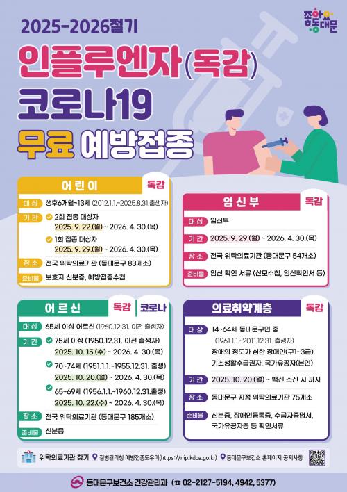 [½Åµ¿¾Æ¹æ¼Û µ¿´ë¹®±¸=À̽ŵ¿±âÀÚ] ¼­¿ï µ¿´ë¹®±¸´Â ¿À´Â 22ÀϺÎÅÍ 2025-2026Àý±â ÀÎÇ÷翣ÀÚ ¿¹¹æÁ¢Á¾À» ½Ç½ÃÇÒ °èȹÀ̶ó°í ¹àÇû´Ù. À̹ø ¿¹¹æÁ¢Á¾Àº °Ü¿ïö ÀÎÇ÷翣ÀÚ À¯Çà¿¡ ´ëºñÇÏ¿© °¨¿° ½Ã ÁßÁõÈ­ À§ÇèÀÌ Å« 6°³¿ù~13¼¼ ¾î¸°ÀÌ(2012.1.1.~2025.8.31.Ãâ»ýÀÚ),¡¦