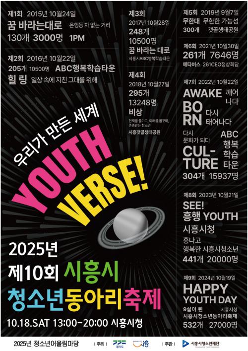 [½Åµ¿¾Æ¹æ¼Û ½ÃÈï½Ã=À̽ŵ¿±âÀÚ] (Àç)½ÃÈï½Ãû¼Ò³âÀç´ÜÀº ¿À´Â 10¿ù 18ÀÏ ½ÃÈï½Ãû¿¡¼­ ¡®Á¦10ȸ ½ÃÈï½Ãû¼Ò³âµ¿¾Æ¸®ÃàÁ¦:¿ì¸®°¡ ¸¸µç ¼¼°è: YOUTHVERSE!¡¯¸¦ °³ÃÖÇÑ´Ù. 2015³â 100°³ µ¿¾Æ¸®·Î Ãâ¹ßÇÑ ½ÃÈï½Ãû¼Ò³âµ¿¾Æ¸®ÃàÁ¦´Â ¿ÃÇØ 550°³ µ¿¾Æ¸®, 8,800¿© ¸íÀÌ Âü¿©¡¦
