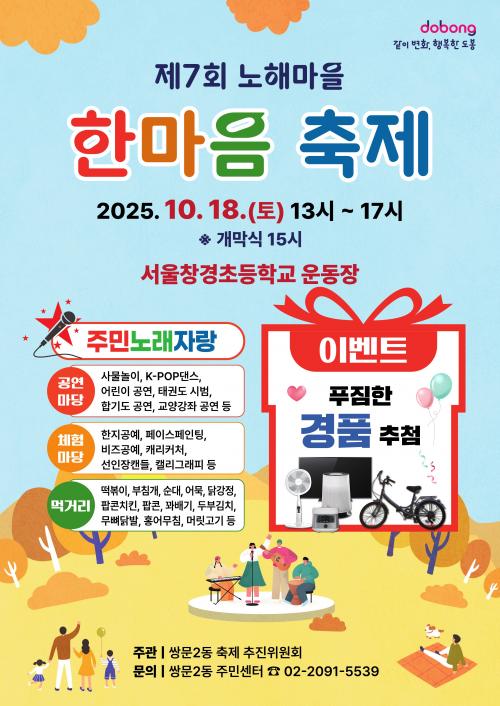[½Åµ¿¾Æ¹æ¼Û µµºÀ±¸=À̽ŵ¿±âÀÚ] ¼­¿ï µµºÀ±¸ ½Ö¹®2µ¿ÀÌ 10¿ù 18ÀÏ ¿ÀÈÄ 1½Ã ¼­¿ïâ°æÃʵîÇб³¿¡¼­ ¡®Á¦7ȸ ³ëÇØ¸¶À» ÇѸ¶À½ ÃàÁ¦¡¯¸¦ °³ÃÖÇÑ´Ù. ½Ö¹®2µ¿ ÃàÁ¦ ÃßÁøÀ§¿øÈ¸°¡ ÁÖÃÖÇÏ´Â À̹ø ÃàÁ¦´Â ¿ÃÇØ·Î 7ȸ°¸¦ ¸Â¾Ò´Ù. ÁֹεéÀÇ °ü½É°ú Âü¿©°¡ ÇØ¸¶´Ù ´õÇØÁö¸ç¡¦