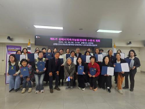 [½Åµ¿¾Æ¹æ¼Û °æ³²±èÇØ=³²±Ã¿µ±â±âÀÚ] ±èÇØ½Ã´Â Áö³­ 30ÀÏ ½Ãû ¼ÒȸÀǽǿ¡¼­ Á¦6±â ±èÇØ½Ã Áö¼Ó°¡´É¹ßÀü´ëÇÐ ¼ö·á½ÄÀ» °³ÃÖÇß´Ù°í 31ÀÏ ¹àÇû´Ù. À̳¯ ¼ö·á½Ä¿¡¼­´Â Àüü ±³À°°úÁ¤ÀÇ 75% ÀÌ»óÀ» À̼öÇÑ 29¸í¿¡°Ô ¼ö·áÁõÀÌ ¼ö¿©µÆ´Ù. Áö¼Ó°¡´É¹ßÀü´ëÇÐÀº Áö¼Ó°¡´É¹ß¡¦
