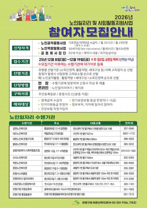[½Åµ¿¾Æ¹æ¼Û ÀºÆò±¸=À̽ŵ¿±âÀÚ] ¼­¿ï ÀºÆò±¸´Â ³»´Þ 8ÀϺÎÅÍ 19ÀϱîÁö ¡®2026³â ³ëÀÎÀÏÀÚ¸® ¹× »çȸȰµ¿ Áö¿ø»ç¾÷¡¯ Âü¿©ÀÚ 6,114¸íÀ» ¸ðÁýÇÑ´Ù°í ¹àÇû´Ù. 2026³â ³ëÀÎÀÏÀÚ¸® »ç¾÷Àº 2025³â ´ëºñ 7.5% È®´ëµÈ ¿ª´ë ÃÖ´ë ±Ô¸ð·Î ÃßÁøµÇ¸ç, ÃÑ 12°³ ¼öÇà±â°ü¿¡¼­ 99°³¡¦