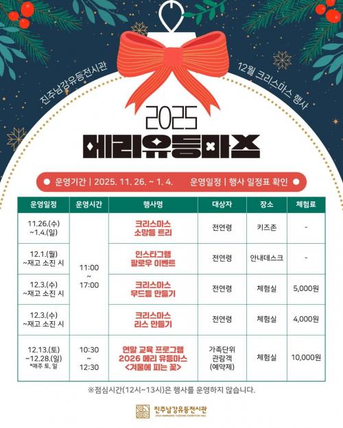 [½Åµ¿¾Æ¹æ¼Û °æ³²ÁøÁÖ=³²±Ã¿µ±â±âÀÚ] ÁøÁֽô 2ÀϺÎÅÍ ¿¬¸» ±â°£¿¡ ÁøÁÖ³²°­À¯µîÀü½Ã°ü¿¡¼­ Å©¸®½º¸¶½º Ưº°Çà»çÀÎ ¡®¸Þ¸®À¯µî¸¶½º¡¯¸¦ °³ÃÖÇÑ´Ù°í ¹àÇû´Ù. ¿ÃÇØ ÇÁ·Î±×·¥Àº ¾î¸°ÀÌ¿Í °¡Á·, ¿¬ÀÎ µî ´Ù¾çÇÑ °ü¶÷°´ÀÌ ÇÔ²² Áñ±æ ¼ö ÀÖµµ·Ï üÇè°ú ±³À°À» °áÇÕÇÑ ¹æ½Ä¡¦