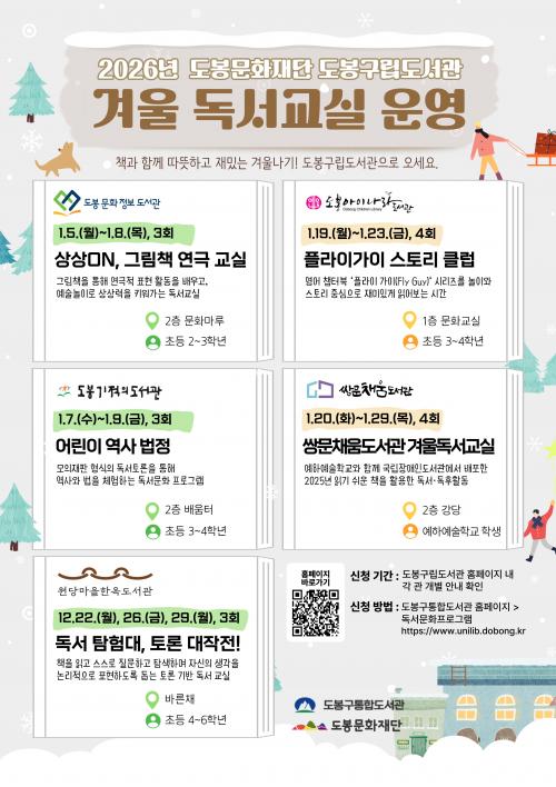 [½Åµ¿¾Æ¹æ¼Û µµºÀ±¸=À̽ŵ¿±âÀÚ] ¼­¿ï µµºÀ±¸ µµºÀ¹®È­Àç´Ü ¼Ò¼Ó ±¸¸³µµ¼­°ü 5°³°üÀÌ ¡®2026³â °Ü¿ï µ¶¼­±³½Ç¡¯À» ¿î¿µÇÑ´Ù. ¡®µ¶¼­±³½Ç¡¯Àº ¸Å³â ¿©¸§¡¤°Ü¿ï¹æÇÐ ±â°£ Áö¿ª ¾î¸°À̵鿡°Ô µ¶¼­¹®È­ üÇè ±âȸ¸¦ Á¦°øÇϱâ À§ÇØ ¿î¿µµÇ´Â ÇÁ·Î±×·¥ÀÌ´Ù. ¿ø´ç¸¶À»ÇÑ¡¦