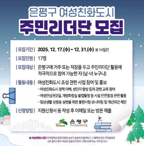 [½Åµ¿¾Æ¹æ¼Û ÀºÆò±¸=À̽ŵ¿±âÀÚ] ¼­¿ï ÀºÆò±¸´Â ¿©¼ºÄ£È­µµ½Ã Á¶¼ºÀ» À§ÇØ ÇÔ²² ÇÒ ¡®¿©¼ºÄ£È­µµ½Ã Áֹθ®´õ´Ü¡¯ ´Ü¿øÀ» »õ·Î ¸ðÁýÇÑ´Ù°í ¹àÇû´Ù. ¸ðÁý ±â°£Àº 31ÀϱîÁö·Î, ¿Â¶óÀÎ ¶Ç´Â ¹æ¹® Á¢¼ö°¡ °¡´ÉÇϸç ÀºÆò±¸¿¡ °ÅÁÖÇϰųª Á÷ÀåÀ» µÐ ÁֹΠÁß Áֹθ®´õ´Ü Ȱµ¿¡¦