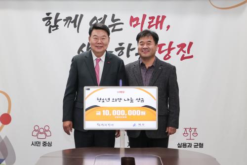 [½Åµ¿¾Æ¹æ¼Û=ÀÌÀçö±âÀÚ] ¢ßº®¿ì(´ëÇ¥ ÇѱâÈï)´Â Áö³­ 30ÀÏ ¿ÀÈÄ ´çÁø½Ãû 7Ãþ Á¢°ß½Ç¿¡¼­ Áö¿ª ³» ¾î·Á¿î ÀÌ¿ôÀ» µ½±â À§ÇÑ ¼º±Ý 1000¸¸ ¿øÀ» ´çÁø½Ã¿¡ ±âŹÇß´Ù. À̳¯ ±âŹ½Ä¿¡´Â ÇѱâÈï ¢ßº®¿ì ´ëÇ¥¿Í ¼Û¼º½Ä ºÎÀåÀ» ºñ·ÔÇØ ¿À¼ºÈ¯ ´çÁø½ÃÀåÀÌ Âü¼®ÇØ ³ª´®ÀÇ ¶æÀ»¡¦