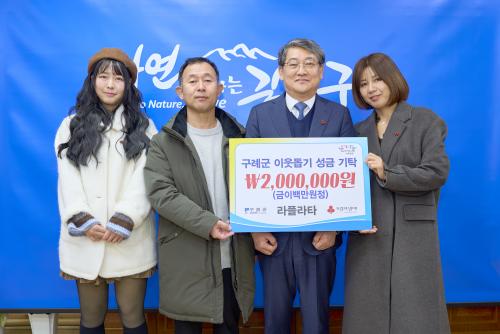 [½Åµ¿¾Æ¹æ¼Û ±¸·Ê=À±¼ºÁÖ ±âÀÚ] ±¸·Ê±ºÀº 12¿ù 31ÀÏ(¼ö) ±¸·ÊÀ¾¿¡ À§Ä¡ÇÑ Ä«Æä ¶óÇöóŸ(´ëÇ¥ ±è¹Ì¶ó)°¡ ¿¬¸»À» ¸Â¾Æ °ü³» ¾î·Á¿î ÀÌ¿ôÀ» µ½±â À§ÇÑ ¼º±Ý 2¹é¸¸ ¿øÀ» ±âŹÇß´Ù°í ¹àÇû´Ù. À̹ø ±âŹÀº Áö¿ª»çȸ¿¡ ´ëÇÑ ³ª´®À» ²ÙÁØÈ÷ ½ÇÃµÇØ ¿Â ¶óÇöóŸÀÇ Áö¼ÓÀûÀÎ »ç¡¦