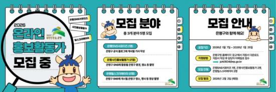 [½Åµ¿¾Æ¹æ¼Û ÀºÆò±¸=À̽ŵ¿±âÀÚ] ¼­¿ï ÀºÆò±¸´Â ÁֹΠÂü¿©Çü »çȸ°ü°è¸Á¼­ºñ½º(SNS) ÄÜÅÙÃ÷¸¦ È®´ëÇÏ°í ±¸Á¤ È«º¸ÀÇ ´Ù¾ç¼ºÀ» ³ôÀ̱â À§ÇØ ¿À´Â 25ÀϱîÁö ¡®2026³â ÀºÆò±¸ ¿Â¶óÀÎ È«º¸È°µ¿°¡¡¯¸¦ ¸ðÁýÇÑ´Ù°í ¹àÇû´Ù. ÀºÆò±¸ ¿Â¶óÀÎ È«º¸È°µ¿°¡´Â ÀºÆò±¸ÀÇ ¼ûÀº ¸í¼Ò¿Í¡¦