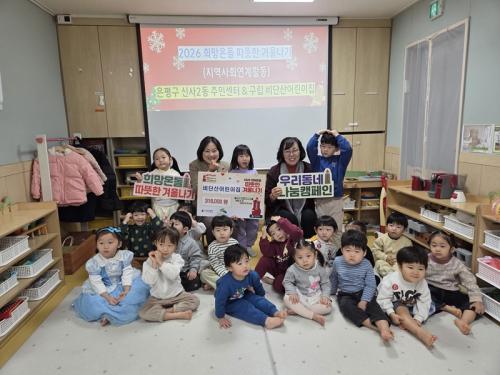 [½Åµ¿¾Æ¹æ¼Û ÀºÆò±¸=À̽ŵ¿±âÀÚ] ¼­¿ï ÀºÆò±¸ ½Å»ç2µ¿Àº Áö³­ 13ÀÏ ±¸¸³ºñ´Ü»ê¾î¸°ÀÌÁýÀ¸·ÎºÎÅÍ ¡®2026 Èñ¸Á¿Âµ¹ µû¶æÇÑ °Ü¿ï³ª±â¡¯ ¼º±Ý 31¸¸ 8õ ¿øÀ» Àü´Þ¹Þ¾Ò´Ù°í ¹àÇû´Ù. À̹ø ¼º±ÝÀº ±¸¸³ºñ´Ü»ê¾î¸°ÀÌÁý ¿ø¾Æ¿Í Çкθð, ±³Á÷¿øµéÀÌ ÇÔ²² Âü¿©ÇÑ ¹ÙÀÚȸ ¼öÀͱÝÀ»¡¦