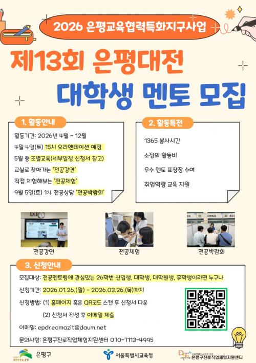 [½Åµ¿¾Æ¹æ¼Û ÀºÆò±¸=À̽ŵ¿±âÀÚ] ¼­¿ï ÀºÆò±¸´Â ÀºÆò±¸Áø·ÎÁ÷¾÷üÇèÁö¿ø¼¾ÅÍ ÁÖ°üÀ¸·Î ÁøÇàµÇ´Â Áø·Î¡¤ÁøÇÐ Áö¿ø»ç¾÷ ¡®Á¦13ȸ ÀºÆò´ëÀü¡¯¿¡ Âü¿©ÇÒ ´ëÇлý ¸àÅ並 ¸ðÁýÇÑ´Ù°í ¹àÇû´Ù. ¡®ÀºÆò´ëÀü¡¯Àº ¡®Àº±ÙÈ÷ Æò¹üÇÑ ´ëÇлýµéÀÇ Àü°ø À̾߱⡯ÀÇ ÁÙÀÓ¸»·Î, ´ëÇлý ¡¦