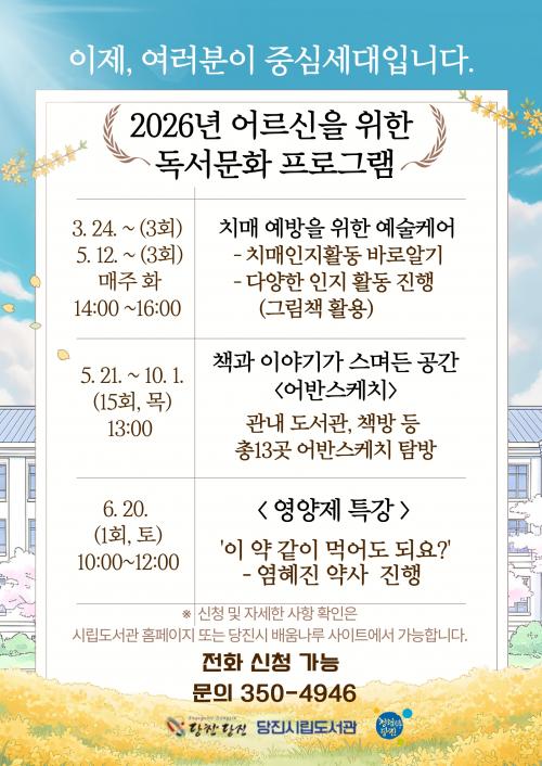 [½Åµ¿¾Æ¹æ¼Û=ÀÌÀçö±âÀÚ] ´çÁø½Ã´Â ¾î¸£½ÅµéÀÌ Ã¥À» ¸Å°³·Î ´Ù¾çÇÑ ¹®È­ Ȱµ¿À» °æÇèÇÏ¸ç °Ç°­°ú »îÀÇ ÁúÀ» ³ôÀ̱â À§ÇØ ½Ã¸³¼Û¾Çµµ¼­°ü¿¡¼­ ¾î¸£½Å ´ë»ó µ¶¼­¹®È­ ÇÁ·Î±×·¥À» ¿î¿µÇÑ´Ù°í 10ÀÏ ¹àÇû´Ù. ¸ÕÀú ¿À´Â 3¿ù 24ÀϺÎÅÍ 5¿ù 12ÀϱîÁö 1¡¤2Â÷·Î ³ª´² ¡®Ä¡¸Å ¡¦