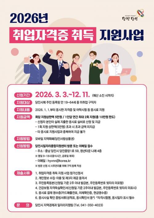 [½Åµ¿¾Æ¹æ¼Û=ÀÌÀçö±âÀÚ] ´çÁø½Ã´Â ½Ã¹ÎµéÀÇ Ãë¾÷ ¿ª·® °­È­¸¦ À§ÇØ ¡®2026³â Ãë¾÷ ÀÚ°ÝÁõ Ãëµæ Áö¿ø»ç¾÷¡¯À» ÃßÁøÇϰí Áö¿ø ´ë»óÀÚ¸¦ ¸ðÁýÇÑ´Ù°í 20ÀÏ ¹àÇû´Ù. À̹ø »ç¾÷Àº Ãë¾÷À» ÁغñÇÏ´Â ½Ã¹ÎµéÀÌ ÀÚ°ÝÁõ ¹× ¾îÇÐ ½ÃÇèÀ» ÀÀ½Ã·á ºÎ´ã ¾øÀÌ µµÀüÇÒ ¼ö ÀÖµµ·Ï Áö¿ø¡¦
