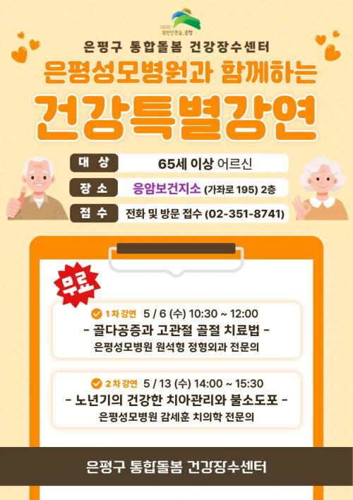 [½Åµ¿¾Æ¹æ¼Û ÀºÆò±¸=À̽ŵ¿±âÀÚ] ¼­¿ï ÀºÆò±¸´Â ´ÙÀ½ ´Þ 6Àϰú 13ÀÏ ±¸¹ÎÀÇ °Ç°­ÇÑ ³ëÈÄ»ýȰÀ» Áö¿øÇϱâ À§ÇØ 65¼¼ ÀÌ»ó ¾î¸£½ÅÀ» ´ë»óÀ¸·Î ¡®°Ç°­Æ¯º°°­¿¬¡¯À» ¿î¿µÇÑ´Ù°í ¹àÇû´Ù. À̹ø °­¿¬Àº ÀºÆò±¸ ÅëÇÕµ¹º½ °Ç°­Àå¼ö¼¾ÅÍ¿¡¼­ ÁøÇàµÇ¸ç, ³ë³â±â¿¡ ÀÚÁÖ ¹ß»ýÇÏ´Â ¡¦