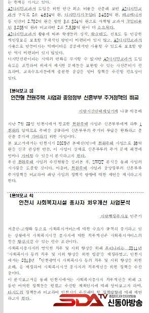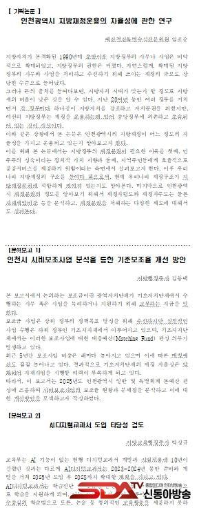ºÐ¼® º¸°í ÁÖÁ¦´Â ¢ºÁö¹æÀçÁ¤ ¼¼ÀÔ‧¼¼ÃâÀÇ ¹®Á¦Á¡À» ºÐ¼®ÇÑ ¡®ÀÎõ±¤¿ª½Ã Áö¹æÀçÁ¤ ¿î¿ëÀÇ ÀÚÀ²¼º¿¡ °üÇÑ ¿¬±¸¡¯ ¢ºÁö¹æ º¸Á¶»ç¾÷ Áõ°¡ ¼Ó ±âÃÊÁöÀÚüÀÇ Àç¿ø ºÐ´ã ¹®Á¦¸¦ ºÐ¼®ÇÑ ¡®ÀÎõ½Ã ½Ãºñ º¸Á¶»ç¾÷ ºÐ¼®À» ÅëÇÑ ±âÁØ º¸Á¶À² °³¼± ¹æ¾È¡¯ ¢º2025³â Àü¸é µµÀÔÀ» ¾ÕµÐ µðÁöÅб³°ú¼¿¡ ´ëÇÑ ¹®Á¦Á¡À» ºÐ¼®ÇÑ ¡®AIµðÁöÅб³°ú¼ µµÀÔ Å¸´ç¼º °ËÅ䡯 ¢ºÃÖ±Ù ÀÎõ½Ã¿¡¼ ¹ßÇ¥ÇÑ ÁÖ°ÅÁ¤Ã¥À» ºÐ¼®ÇÑ ¡®ÀÎõÇü õ¿ø ÁÖÅà »ç¾÷°ú Áß¾ÓÁ¤ºÎ ½ÅÈ¥ºÎºÎ ÁÖ°ÅÁ¤Ã¥ÀÇ ºñ±³¡¯ ¢º»çȸº¹Áö¼ºñ½º ¼ö¿ä Áõ°¡¿Í ´õºÒ¾î ´ëµÎµÇ°í ÀÖ´Â Á¾»çÀÚ Ã³¿ì°³¼± ¹®Á¦¸¦ ºÐ¼®ÇÑ ¡®ÀÎõ½Ã »çȸº¹Áö½Ã¼³ Á¾»çÀÚ Ã³¿ì°³¼± »ç¾÷ºÐ¼®¡¯ µî ÃÑ 5°¡Áö ÁÖÁ¦¸¦ ¼±Á¤ÇØ ÀÛ¼ºµÆ´Ù.