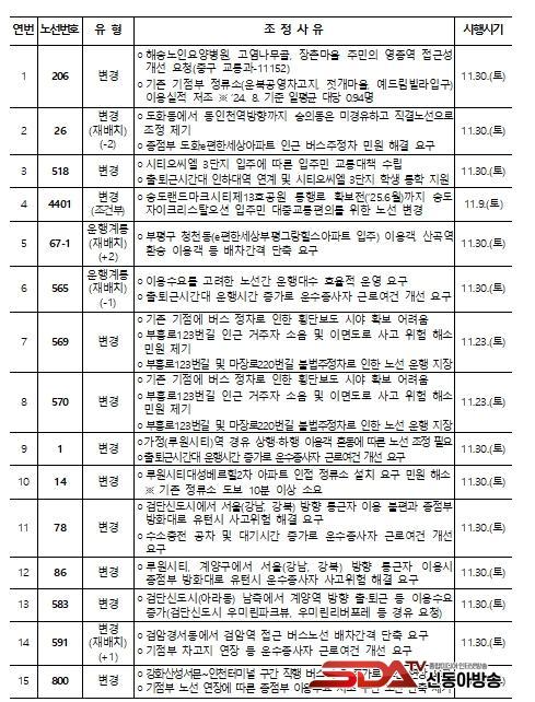 ÀÎõ½Ã °ü°èÀÚ´Â À̹ø Á¶Á¤À» ÅëÇØ ¡ã´ë±Ô¸ð ¾ÆÆÄÆ®´ÜÁö Á¶¼ºÁö¿ª¿¡ ³ë¼± È®Ãæ(1, 14, 67-1, 518, 4401¹ø) ¡ã¿î¼öÁ¾»çÀÚ ±Ù·Î¿©°Ç °³¼± ¹× ¾ÈÀü¼º °È(26, 78, 86, 569, 570¹ø) ¡ãÁöÇÏö¿ª ¿¬°è, ½Â°´ °ú¼Ò ¹× ¿îÇà ºÒÇÕ¸® ±¸°£À» Á¤ºñ(206, 565, 583, 591, 800¹ø)ÇÏ¿© ¹ö½º ¿îÇàÀÇ ¾ÈÁ¤¼ºÀ» °ÈÇϰí È¿À²¼ºÀ» µµ¸ðÇÒ ¼ö ÀÖÀ» °ÍÀ̶ó°í ¹àÇû´Ù.