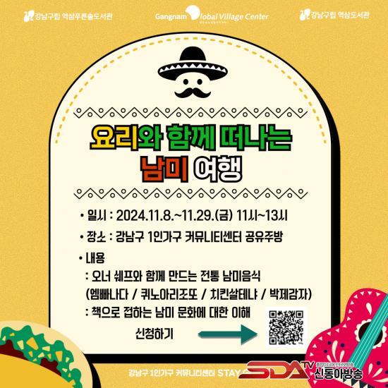 11¿ù 8ÀϺÎÅÍ 29ÀϱîÁö ¸ÅÁÖ ±Ý¿äÀÏ 11½ÃºÎÅÍ 13½Ã±îÁö ¡®¿ä¸®·Î ¶°³ª´Â ³²¹Ì ¿©Ç࡯À» ÁøÇàÇÑ´Ù. °­³²±Û·Î¹úºô¸®Áö¼¾ÅÍ¿Í ¿¬°èÇØ ³²¹Ì Ãâ½Å ¿À³Ê½¦ÇÁÀÎ ±è³ª¿µ ¾¾°¡ °­»ç·Î Âü¿©ÇØ, ³²¹ÌÀÇ ´ëÇ¥ ¿ä¸®ÀÎ ¿¥ÆÄ³ª´Ù, Äû³ë¾Æ ¸®¼ÒÅä, ġŲ »ìÅ׳Ä, ¹ÚÁ¦°¨ÀÚ µî ´Ù¾çÇÑ ¿ä¸®¸¦ ¼±º¸ÀδÙ. ÀÌ ±â°£ ¿ª»ïµµ¼­°ü, ¿ª»ïǪ¸¥¼Öµµ¼­°ü°ú Çù·ÂÇØ ³²¹Ì ¿ä¸®¿Í ¹®È­¸¦ ¼Ò°³Çϴ å 100±ÇÀ» ¼±Á¤ÇØ ¼¾ÅÍ ³» ·Îºñ¿¡ Àü½ÃÇÒ °èȹÀÌ´Ù.