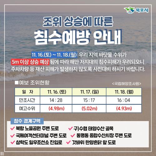 [½Åµ¿¾Æ¹æ¼Û=±è±¤½Ä±âÀÚ] ¸ñÆ÷½Ã´Â ´ëÁ¶±âÀÎ ¿À´Â 16ÀϺÎÅÍ 18ÀϱîÁö ¿ÀÈÄ 1½Ã ~ 5½Ã »çÀÌ ¹Ù´å¹° ¼öÀ§°¡ 5.0m ÀÌ»ó (Á¶¼®Ç¥»ó 11/17 ÃÖ°í 5.02m) »ó½Â ¿¹»óµÊ¿¡ µû¶ó ÇÇÇØ¸¦ ÀÔÁö ¾Êµµ·Ï öÀúÇÑ ´ëºñ¸¦ ´çºÎÇß´Ù.