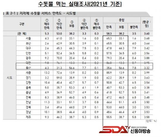¡®¼öµ¾¹° ¼ºñ½º ¸¸Á·µµ¡¯ Áú¹®¿¡´Â ÀÎõÁö¿ª 57.5%°¡ ¡®¸¸Á·¡¯À̶ó°í ´äÇØ 7´ë Ư¡¤±¤¿ª½Ã Áß ¿ï»ê(35.5%)¡¤´ë±¸(47.8%)¿¡ À̾î 5À§¸¦ ±â·ÏÇß´Ù. 36.5%´Â ¡®º¸Å롯, 6.0%´Â ¡®ºÒ¸¸Á·¡¯À¸·Î ÀÀ´äÇß´Ù.