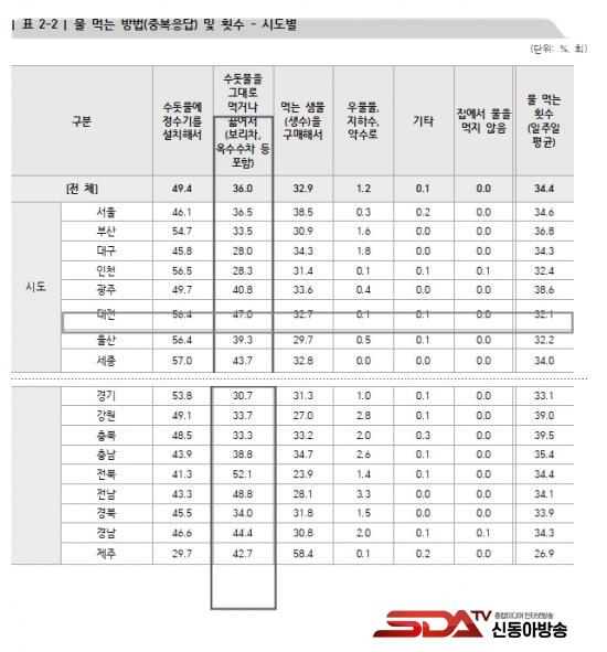 ÇöÇà ¼öµµ¹ý¿¡ µû¶ó Àü±¹ ½Ã¡¤±ºÀ» ´ë»óÀ¸·Î 3³â¸¶´Ù ÀÌ·ïÁö´Â ÇØ´ç ½ÇÅÂÁ¶»ç¿¡¼ 2021³â ±âÁØ ÀÎõ Áö¿ª 1õ530°¡±¸ Áß ¡®¼öµ¾¹°À» ±×´ë·Î ¸Ô°Å³ª ²ú¿©¼ ¸¶½Å´Ù¡¯´Â ÀÀ´äÀº 28.3%¿´´Ù. Àü±¹ 17°³ ½Ãµµ °¡¿îµ¥ ´ë±¸(28.0%) ´ÙÀ½À¸·Î ³·Àº 16À§¿¡ ÇØ´çÇÏ´Â ¼öÄ¡´Ù.