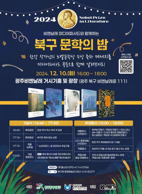 28ÀÏ ºÏ±¸¿¡ µû¸£¸é ´Ù°¡¿À´Â ¡®ÇѰ­ ÀÛ°¡ ³ëº§¹®Çлó ½Ã»ó½Ä¡¯À» ±â³äÇÏ¿© ¿À´Â 12¿ù 10ÀÏ ¿ÀÈÄ 4½Ã ±¤ÁÖºñ¿£³¯·¹ °Å½Ã±âȦ°ú ºñ¿£³¯·¹ ±¤Àå¿¡¼­ ¡®¹Ìµð¾îÆÄ»çµå¿Í ÇÔ²²ÇÏ´Â ºÏ±¸ ¹®ÇÐÀÇ ¹ã¡¯ Çà»ç°¡ °³ÃֵȴÙ.
