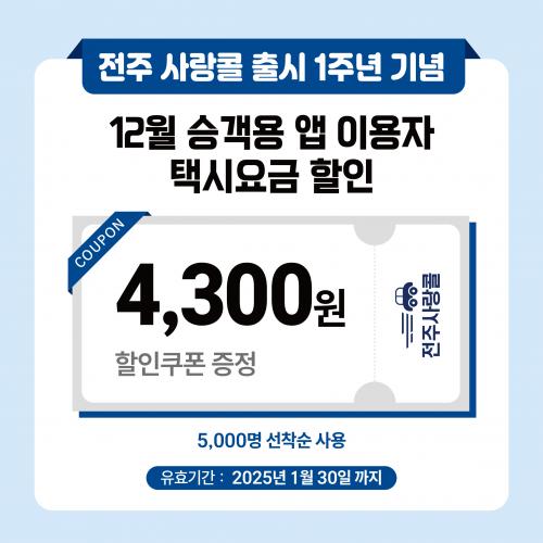 ÀÌ¿¡ ÀüÁÖ»ç¶ûÄÝÀº 1ÁÖ³â °í°´ °¨»ç À̺¥Æ®·Î 12¿ù Áß 1ȸ ÀÌ»ó ¾ÛÀ» ÀÌ¿ëÇÑ °í°´ 5000¸í¿¡°Ô ¼±Âø¼øÀ¸·Î 4300¿ø »ó´çÀÇ ±âº»¿ä±Ý ÄíÆùÀ» Áö±ÞÇÑ´Ù. ÇØ´ç ÄíÆùÀº ÀüÁÖ»ç¶ûÄÝ ¾Û ÄíÆùÇÔ¿¡¼­ È®ÀÎÇÒ ¼ö ÀÖ´Ù.