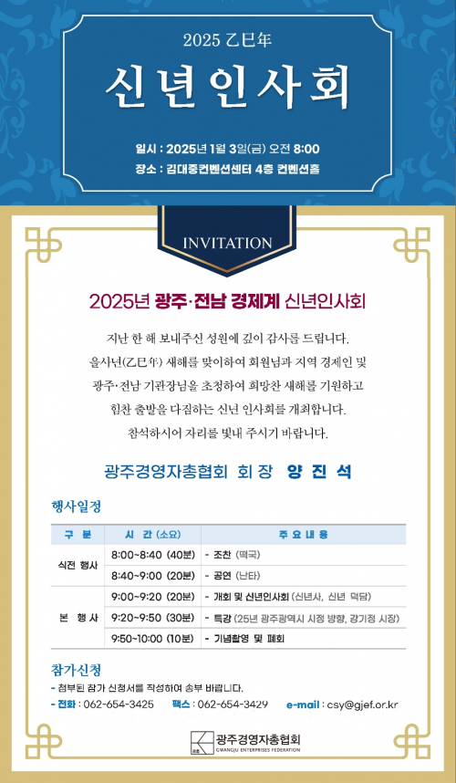 [½Åµ¿¾Æ¹æ¼Û=À̺´½Ä±âÀÚ] ±¤Áְ濵ÀÚÃÑÇùȸ(ȸÀå ¾çÁø¼®, ¢ßÈ£¿ø¡¤ÇØÇǴϽºCC ȸÀå)°¡ 1¿ù 3ÀÏ ±Ý¿äÀÏ ¿ÀÀü 9½Ã ±è´ëÁßÄÁº¥¼Ç¼¾ÅÍ 4Ãþ ÄÁº¥¼ÇȦ¿¡¼­ ¡®2025³â ±¤ÁÖ․Àü³² ½Å³âÀλçȸ¡¯¸¦ °³ÃÖÇÑ´Ù°í ¹àÇû´Ù.