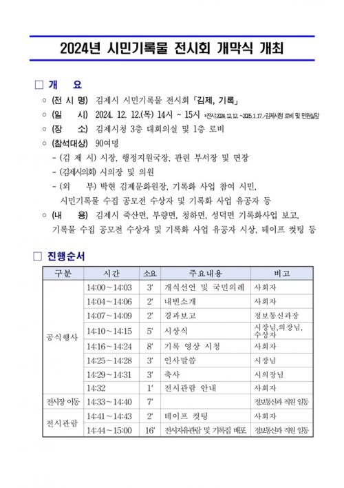 À̹ø Àü½Ãȸ´Â ¡ã±èÁ¦½Ã Á×»ê¸é, ºÎ·®¸é, ûÇϸé, ¼º´ö¸é ±â·ÏÈ ¡ã½Ã¹Î±â·Ï¹° °ø¸ðÀü Àü½Ã 2°¡Áö Å׸¶·Î ³ª´©¾î ±¸¼ºÇß´Ù. ±â·ÏÈ Àü½Ã´Â °¢ Áö¿ªÀÇ ¿ª»ç¹®È¸¦ ¼Ò°³Çϸç ÁֹεéÀÇ ÀÎÅͺä·Î ¸¶À»ÀÇ À̾߱⸦ Ç®¾î³»¾î Áö¿ª¸¸ÀÇ °¡Ä¡¸¦ ÀçÁ¶¸íÇßÀ¸¸ç, ÁֹεéÀÌ ¼ÒÀåÇϰí ÀÖ´Â ¿¾ »çÁø, ¹Ú¹° µîµµ ÇÔ²² Àü½ÃÇß´Ù.