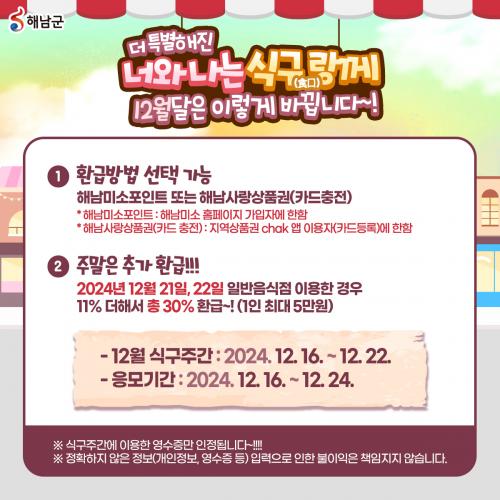 ±ºÀº ¿¬¸»À» ¸Â¾Æ 12¿ù ½Ä±¸ÁÖ°£(12.16.~12.22.)¿¡´Â ±âÁ¸´ë·Î 19%¸¦ ȯ±ÞÇϰí, 12¿ù 21~22ÀÏ, 28~29ÀÏ¿¡´Â ±âÁ¸ 19%¿¡¼ 11%¸¦ ´õÇÑ 30%±îÁö ȯ±ÞÀ» ½Ç½ÃÇÑ´Ù.