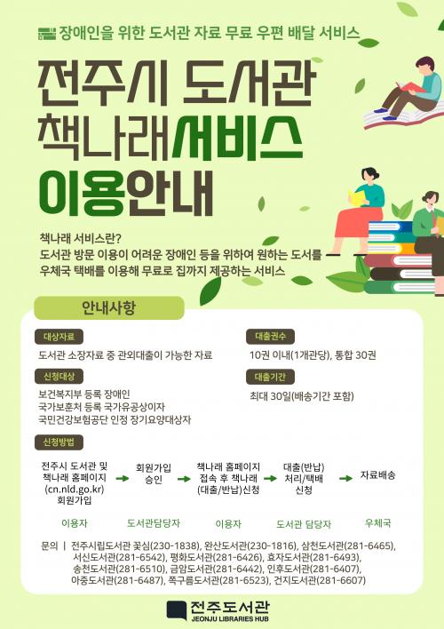 ¼ºñ½º ÀÌ¿ëÀ» ¿øÇÏ´Â ½Ã¹ÎÀº ÀüÁֽø³µµ¼°ü ´©¸®Áý(lib.jeonju.go.kr)°ú Ã¥³ª·¡ ´©¸®Áý(cn.nl.go.kr)¿¡ °¢°¢ ȸ¿øÀ¸·Î °¡ÀÔÇÑ µÚ Ã¥³ª·¡ ´©¸®ÁýÀ» ÅëÇØ Èñ¸ÁÇÏ´Â µµ¼°ü ÀڷḦ ´ëÃ⡤¹Ý³³ ½ÅûÇÏ¸é µÈ´Ù. ±âŸ Áõºù¼·ù ¹× ȸ¿ø°¡ÀÔ ÀýÂ÷´Â ÇØ´ç µµ¼°ü¿¡ ¹®ÀÇÇϸé ÀÚ¼¼È÷ ¾È³»¹ÞÀ» ¼ö ÀÖ´Ù.