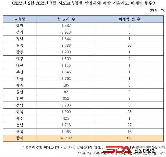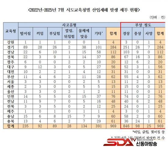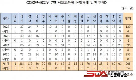 ¡à ±¹È¸ ±³À°À§¿øÈ¸ ¹é½Â¾Æ ÀÇ¿ø(´õºÒ¾î¹ÎÁÖ´ç, ºñ·Ê´ëÇ¥)ÀÌ Àü±¹ ½Ã¡¤µµ±³À°Ã»À¸·ÎºÎÅÍ Á¦Ãâ¹ÞÀº ±¹Á¤°¨»ç ÀÚ·á¿¡ µû¸£¸é, 2022³âºÎÅÍ 2025³â 7¿ù±îÁö ±³À°Ã» ¹ßÁÖ °ø»çÇöÀå¿¡¼ ¹ß»ýÇÑ »ê¾÷ÀçÇØ´Â ÃÑ 968°ÇÀ¸·Î Áý°èµÆ´Ù. ÀÌ Áß »ç¸Á»ç°í´Â 24°Ç¿¡ ´ÞÇß´Ù.