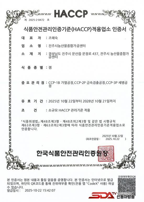ÁøÁֽà ³ó»ê¹°Á¾ÇÕ°¡°ø¼¾ÅÍ´Â Áö¿ª³ó»ê¹°À» Ȱ¿ëÇØ °¡°øÁ¦Ç° °³¹ß°ú ³ó¾÷ÀÎÀÇ ¼ÒµæÃ¢ÃâÀ» µ½°í ÀÖÀ¸¸ç, Áö³ÇØ 7¿ù °úäÁÖ½º·ù¿Í ĵµð·ù 2°³ À¯Çü¿¡ ´ëÇØ ¡®HACCP¡¯ ÀÎÁõÀ» ¹ÞÀº ÈÄ, ¿ÃÇØ 10¿ù 22ÀÏ Àë·ù¿Í ¾×»óÂ÷ 2°³ À¯ÇüÀ» Ãß°¡·Î ÀÎÁõ¹Þ¾Æ ³ó»ê¹°Á¾ÇÕ°¡°ø¼¾ÅÍ¿¡¼ »ý»êµÇ´Â Á¦Ç°ÀÇ ¾ÈÀü¼º°ú ½Å·Úµµ¸¦ ÇÑÃþ ´õ ³ô¿´´Ù.