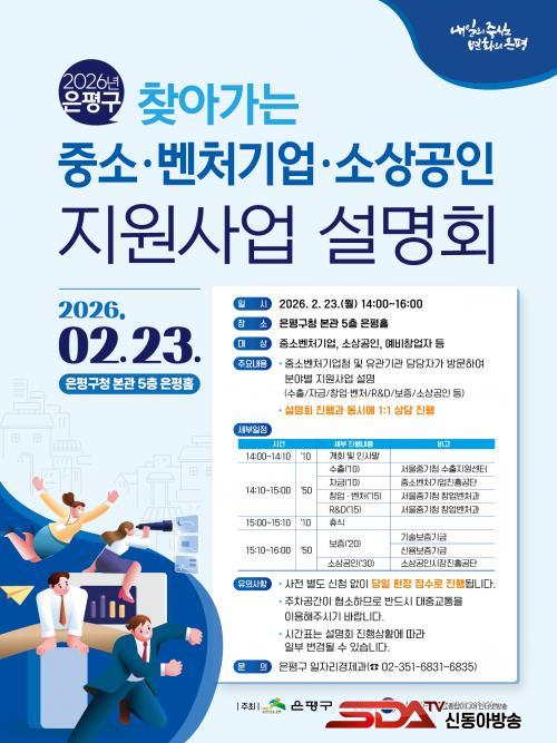 À̹ø ¼³¸íȸ´Â ÀºÆò±¸°¡ ÁÖÃÖÇÏ°í ¼¿ïÁß¼Òº¥Ã³±â¾÷ûÀÌ ÁÖ°üÇϸç, ¿À´Â 23ÀÏ ¿ÀÈÄ 2½ÃºÎÅÍ 4½Ã±îÁö ÀºÆò±¸Ã» º»°ü 5Ãþ ÀºÆòȦ¿¡¼ ¿¸°´Ù.